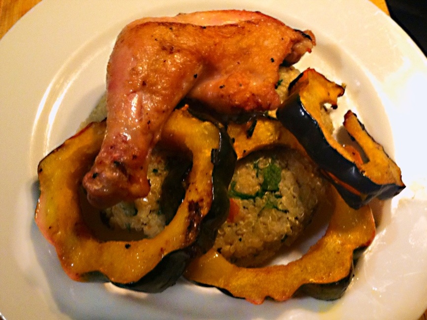 This year, I am determined to experiment with squash other than butternut – delicious as it is. Inspired by the New York Times and the beauties dotting the farmers market, I opted for acorn squash roasted under chicken quarters for an easy but impressive Sunday dinner.