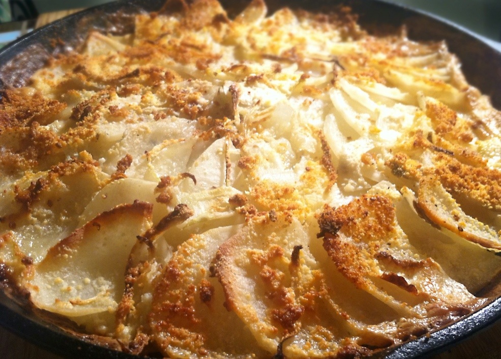 A few notes: I opted for Russet potatoes, but use whatever kind you like (except fingerling!), so long as you have a pound and a half; reduce the amount of butter if you’re using cream instead of milk; omit the pancetta to make this dish vegetarian – but then grease the skillet with butter or olive oil. Finally, this can be baked in a 9 x 12 baking dish if you don’t have a cast iron skillet, but definitely consider investing in one.