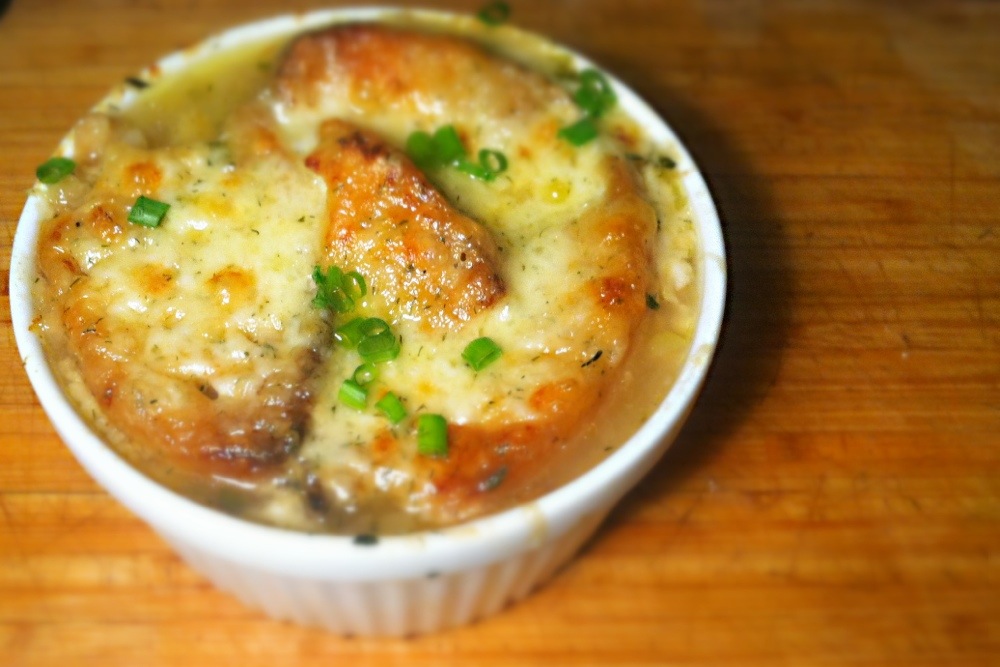 Finally, don’t fret if you don’t have oven proof crocks; this soup can be served alone (it’s that good) – or place your toast on a lined, greased baking sheet and smother with cheese. Broil for a few moments til the cheese is melted, the serve atop your soup. Serves 6.