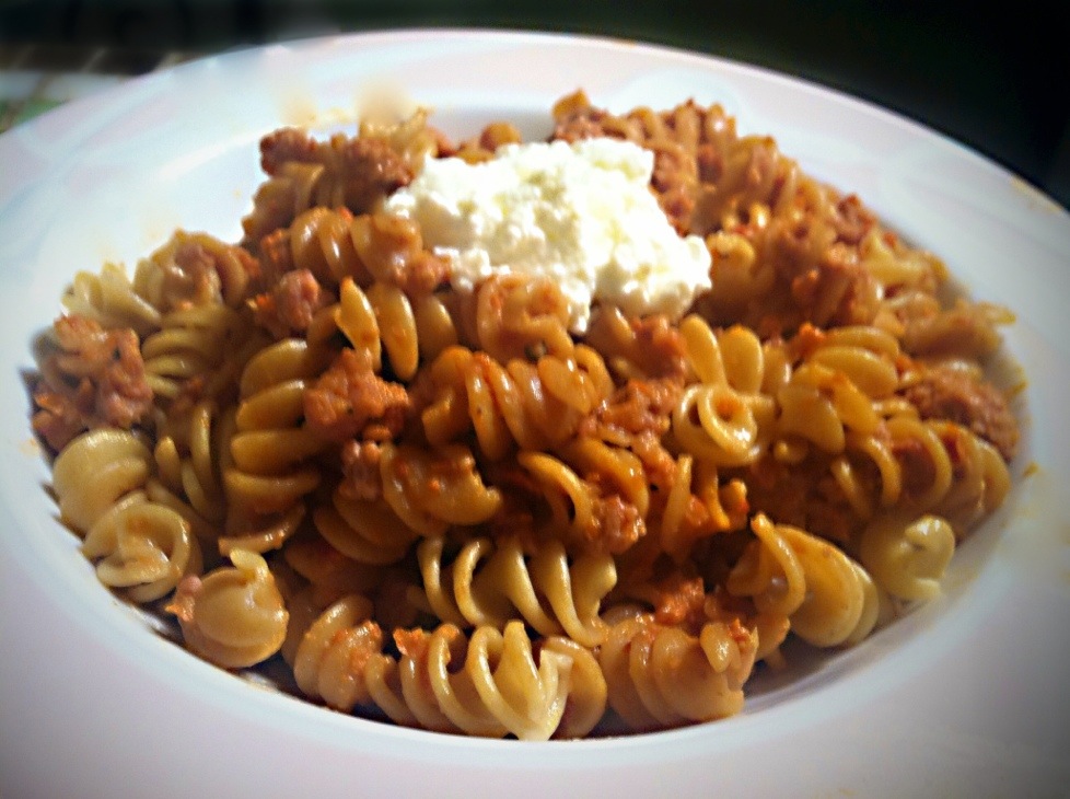 2. While water is heating, drizzle olive oil in a large pan and set heat to medium. Add in sausage and break into smallish clumps. Sauté til lightly browned and cooked through. Remove from heat and set aside.