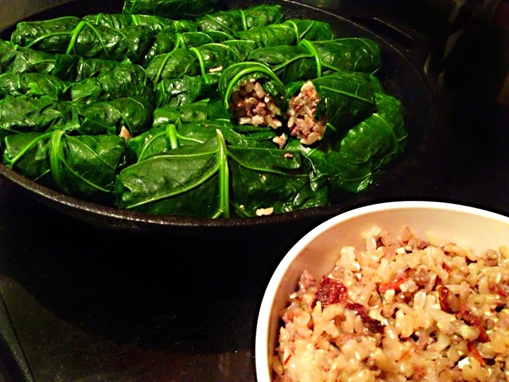 A family friend who runs a deli recently let me in on a secret: collard greens are great when stuffed. More flexible than traditional cabbage leaves, collards resemble grape leaves but require a little less prep. This is a great way to use up all those summer greens. You could even use large kale leaves.