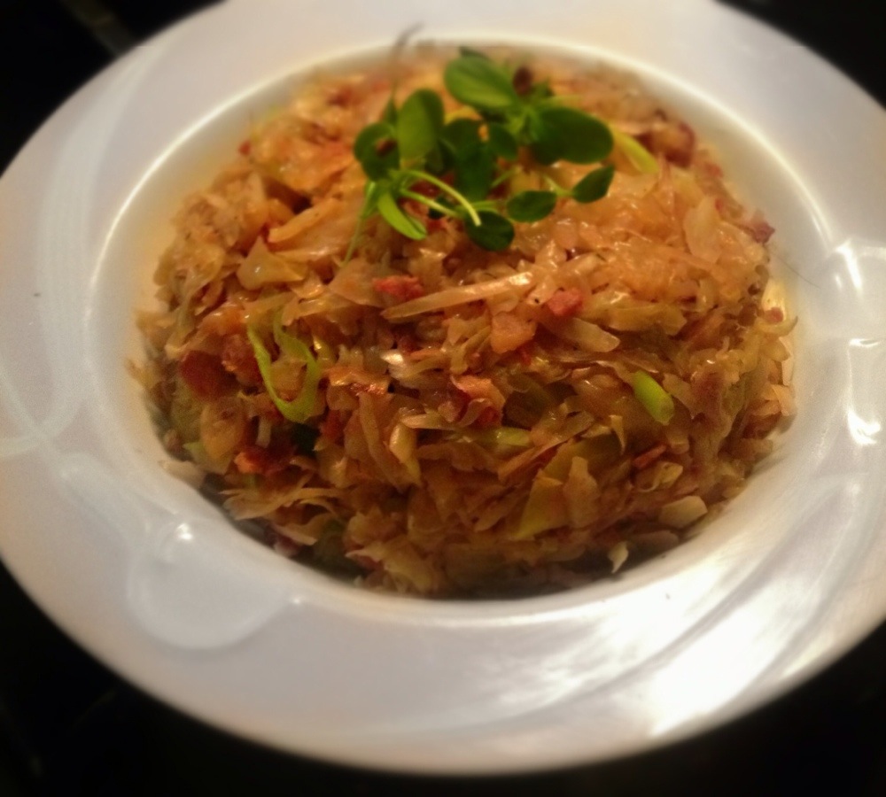 Oh cabbage. How I love this often dismissed vegetable. Practically free at 70 cents a pound, cabbage keeps for weeks and is packed with vitamins and minerals. Though it’s associated with summer slaws, cabbage is available year round at the farmer’s market and equally delicious raw or cooked. I like my cabbage braised, and here, I’ve wilted it down with guanciale – an Italian cured meat similar to bacon – then paired it with apples and shallots to make true winter dish.